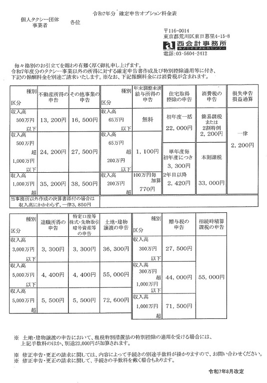 西会計 令和6年分 確定申告オプション料金表
